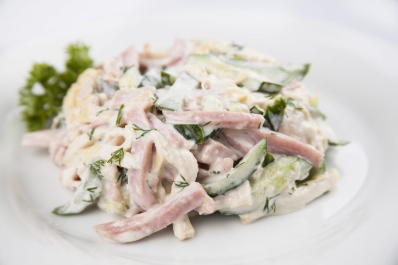 Состав: ветчина, сыр, огурцы маринованные, зеленый горошек, майонез